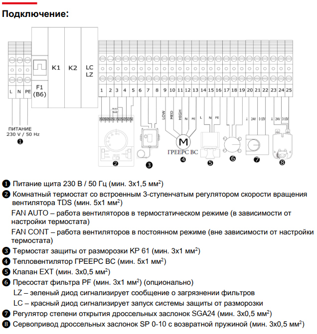 | Регулятор скорости вращения вентилятора: | Комнатный термостат со встроенным трехступенчатым регулятором скорости вращения вентилятора TDS (опция, приобретается отдельно) |