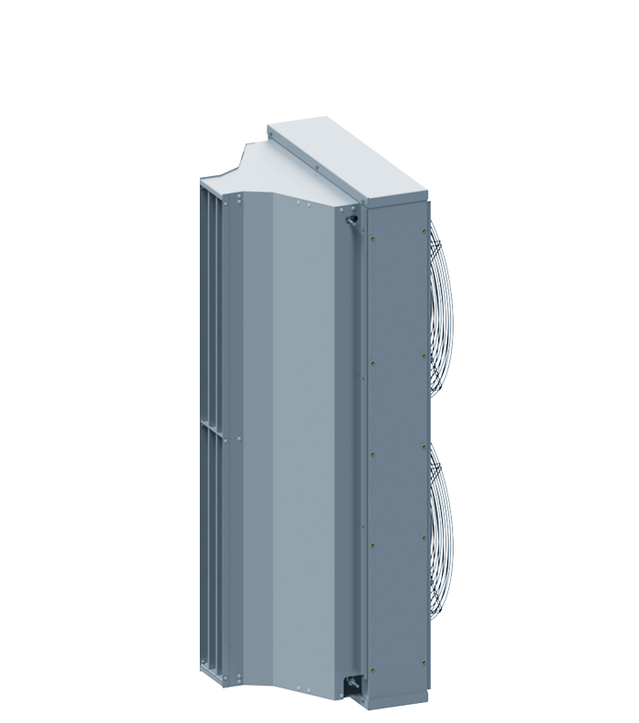 Электрическая тепловая завеса IP54 с повышенной коррозионной стойкостью для проемов высотой от 3 до 7 метров в помещениях с атмосферой, содержащей капельную влагу, например, в автомойках. Под заказ изготавливаются с соплом под углом 30°.