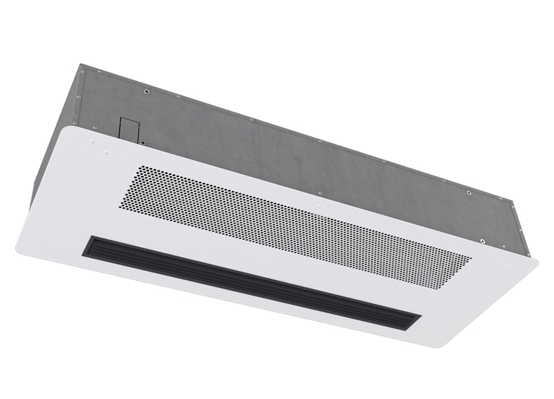 Встраиваемая потолочная воздушно-тепловая завеса для проёмов высотой до 4,5 метров. Тепловая завеса предназначена для скрытой установки за подвесным потолком. Сервис и обслуживание осуществляется через переднюю панель завесы.
