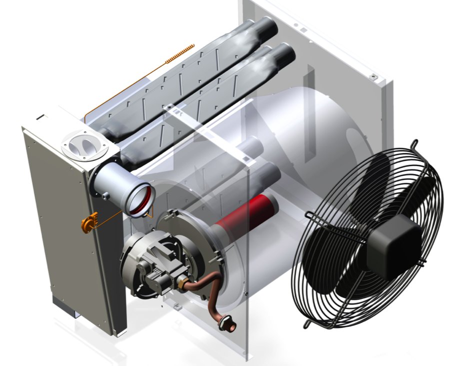 | Тип: | Промышленный, настенный, газовый воздухонагреватель (тепловентилятор, теплогенератор, калорифер) непрямого нагрева (с отводом продуктов сгорания) с осевым вентилятором внутреннего исполнения |