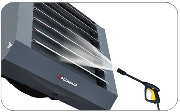 В аппаратах применен специальный вентилятор со степенью защиты IP66, а также эпоксидированный теплообменник с ламелями с увеличенной толщиной. Такое решение дает возможность очистки аппарата сжатым воздухом или водой под высоким давлением. Благодаря раздвижным монтажным консолям возможна простая и быстрая установка воздухонагревателя на стене, а также дают возможность отодвигать аппарат от стены для очистки.