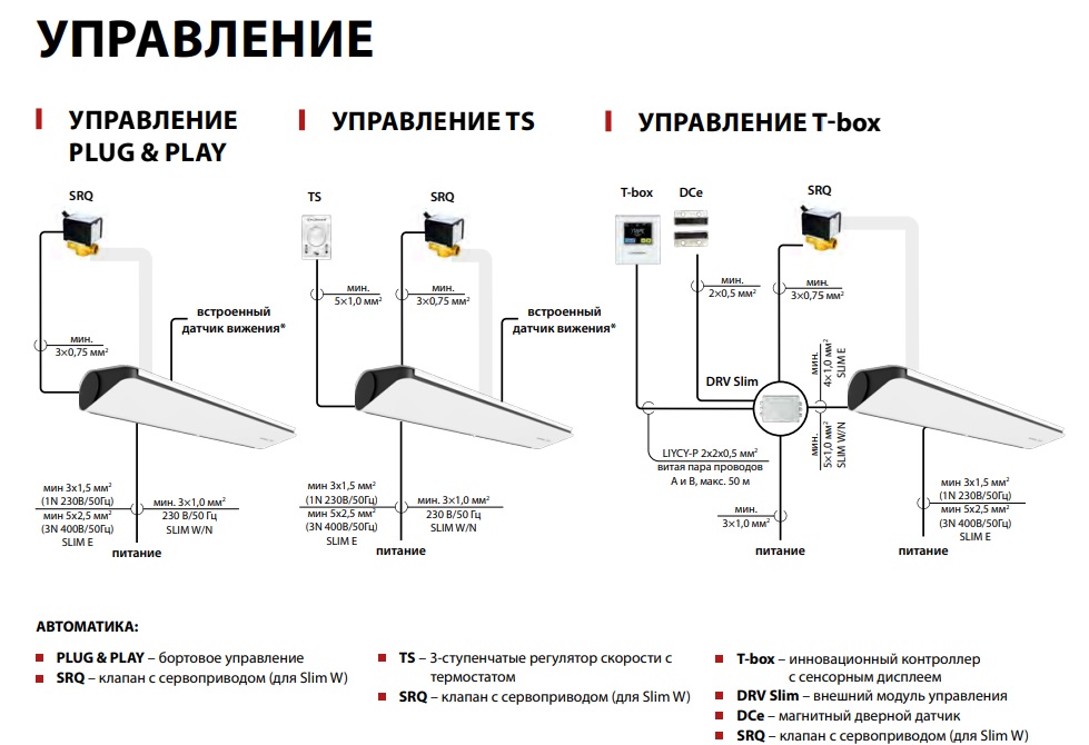 | Комплектация: | Встроенный датчик движения, бортовое управление (кнопки включения/выключения завесы и регулирования скорости). Опции (приобретаются отдельно): комплект кронштейнов для горизонтального или вертикального крепления (черные/белые 56271/56270), TS (3-ступенчатый регулятор скорости с термостатом), T-box (командоконтроллер скорости вращения с жидкокристалическим дисплеем), герконовый магнитный выключатель DCm6T (магнитный щит управления для использования с TS) или DCe6T (магнитный щит управления с реле для использования с T-Box), распределительная коробка RX, модуль управления DRV Slim., двухходовой клапан с сервоприводом типа EXT-SW-E152V4C3 (SRQ2d 1/2”) или трехходовой клапан с сервоприводом типа EXT-SW-E153V4C3 (SRQ3d 1/2”). |