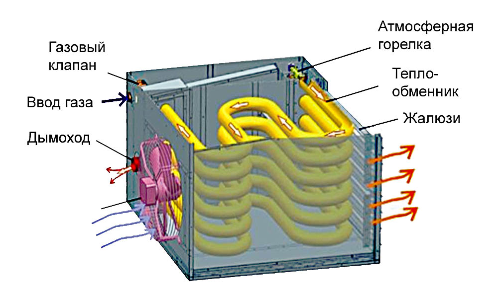 | Комплектация: | Атмосферная горелка с газовым клапаном, система автоматики и управления, вытяжной вентилятор (дымосос), замкнутая камеры сгорания и теплообменник, осевой вентилятор и жалюзи |