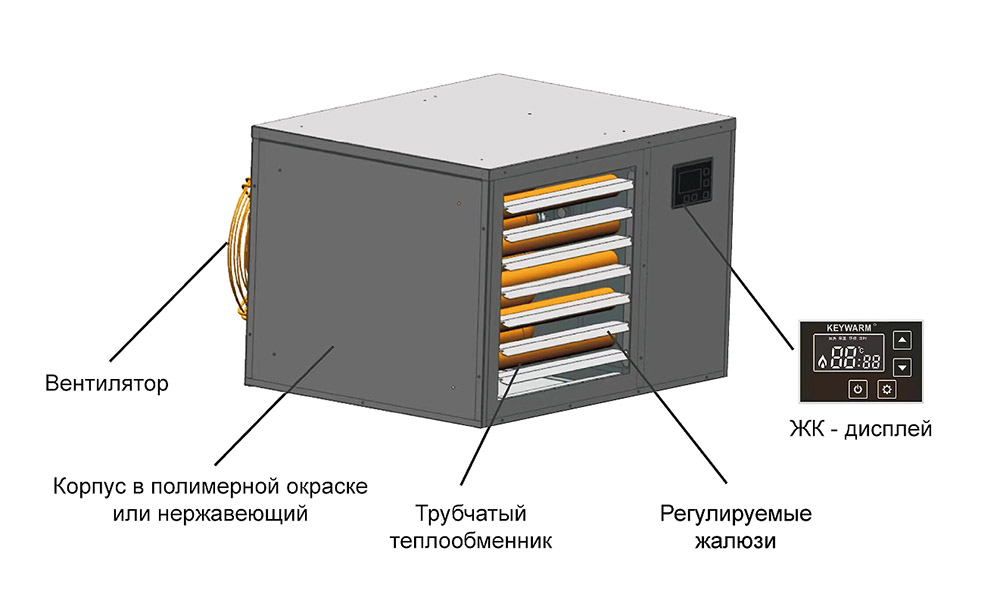 | Тип: | Промышленный, настенный, газовый воздухонагреватель (тепловентилятор, теплогенератор, калорифер) непрямого нагрева (с отводом продуктов сгорания) с осевым вентилятором внутреннего исполнения |