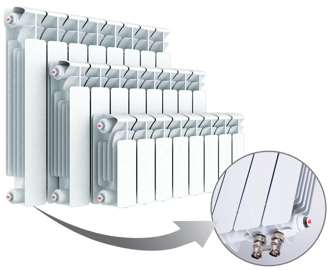 Специально для нижнего подключения разработано конструктивное исполнение алюминиевых и биметаллических радиаторов. Такое исполнение имеет обозначение – VENTIL. В зависимости от выбранной модели после сборки радиатор сохраняет ее теплотехнические и эксплуатационные характеристики. При разработке проекта системы отопления необходимо учесть гидравлические особенности узла нижнего подключения и термостатического клапана согласно оговоренной комплектации.