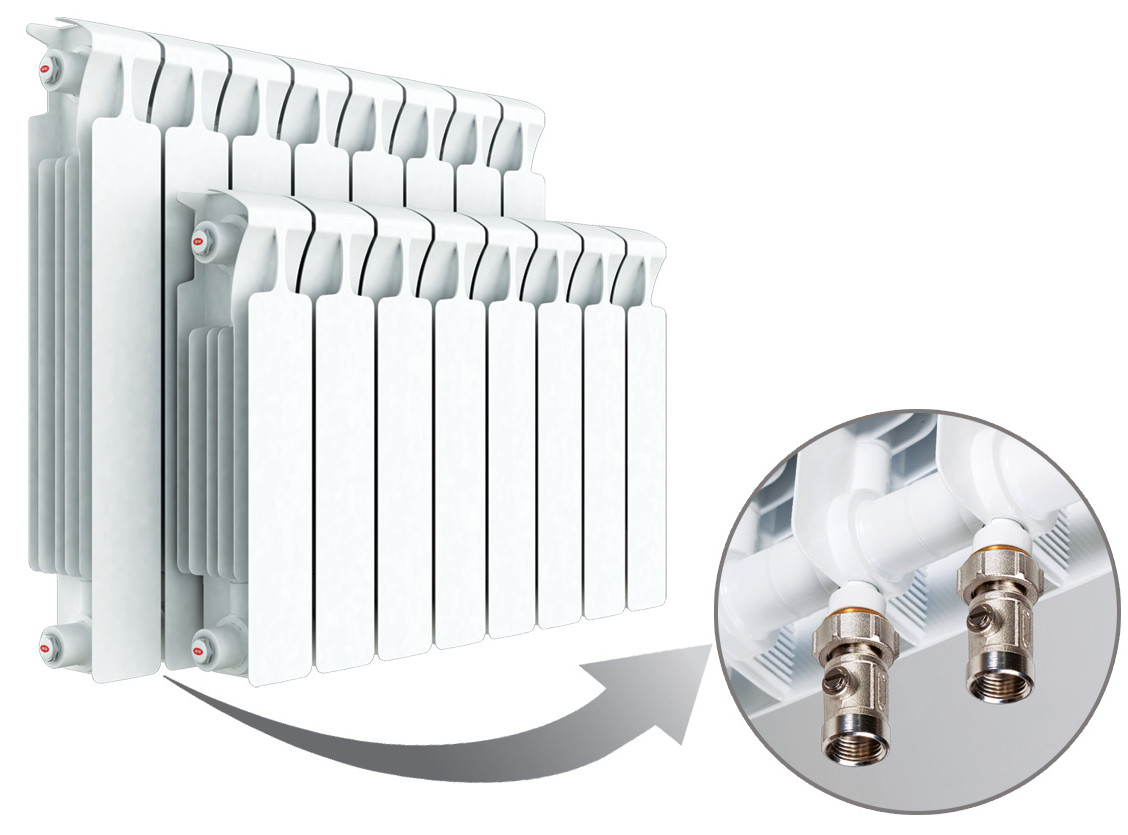 Специально для нижнего подключения разработано конструктивное исполнение алюминиевых и биметаллических радиаторов. Такое исполнение имеет обозначение – VENTIL. В зависимости от выбранной модели после сборки радиатор сохраняет ее теплотехнические и эксплуатационные характеристики. При разработке проекта системы отопления необходимо учесть гидравлические особенности узла нижнего подключения и термостатического клапана согласно оговоренной комплектации.