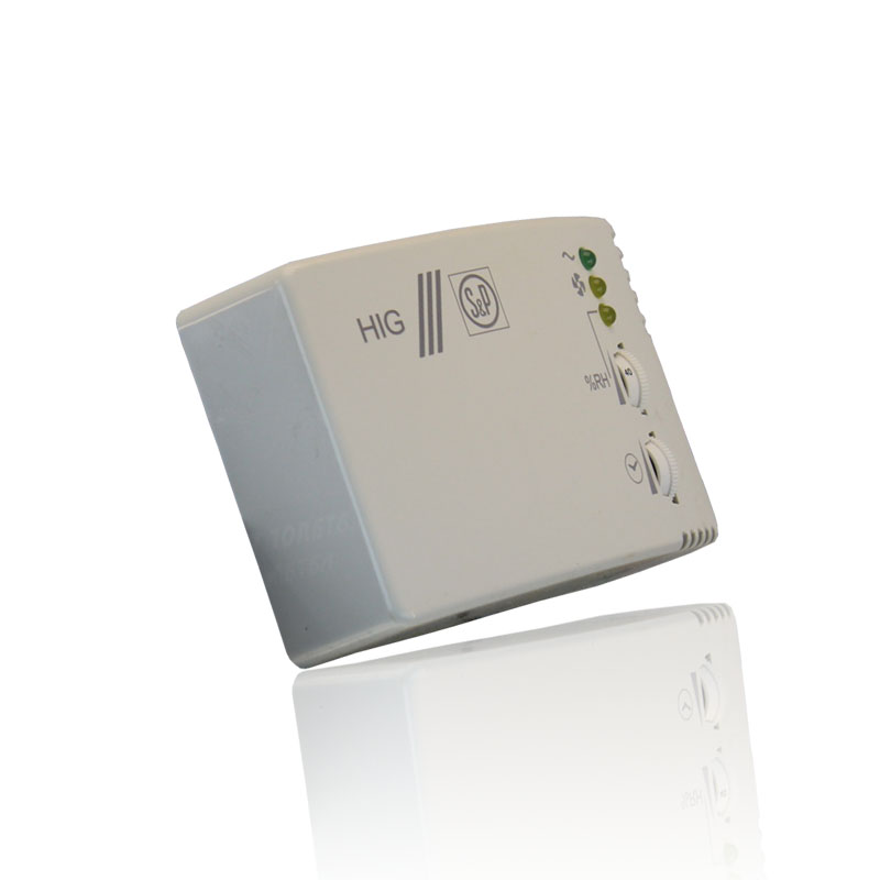 Гигростат (датчик влажности) с таймером выключения HIG-2 предназначен для автоматического включения вентилятора при превышении установленного значения относительной влажности воздуха в помещении в диапазоне от 60% до 90%. После достижения требуемой величины влажности гигростат выключается и начинает работать таймер задержки отключения. Диапазон настройки таймера от 2 до 20 минут. После завершения работы по таймеру вентилятор автоматически отключается и гигростат переходит в режим ожидания. Электробезопасность - класс II. Регулировка чувствительности датчика влажности и времени задержки отключения осуществляется удобными регуляторами, расположенными на передней панели. Режимы работы обозначены соответствующей индикацией: верхний индикатор (зеленого цвета) горит постоянно (режим ожидания), средний индикатор (желтого цвета) горит во время работы таймера задержки отключения, нижний индикатор (желтого цвета) загорается при работе вентилятора от датчика контроля влажности.